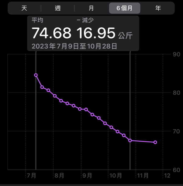 雖然太太碎念要我減肥的話語,很刺耳。但還不至於激勵我真正執行減肥,直到某些原因和契機(以後再說),就開始了第三次減肥,在三個多月的時間,就減到67公斤左右,主要是以飲食控制為主,運動為輔達成,這次減肥,採用佛系能持之以恆的方式進行,避免再度半途而廢。實際的方式,之後再和各位分享。